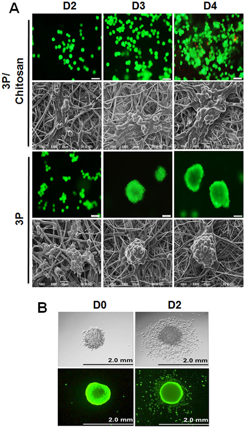 In another study with breast cancer cells, Rabionet et al (2017) showed that isolated MDA-MB-231 triple negative cell line responded differently for electrospun PCL fibers with different diameters and tissue culture plate (TCP). Cell proliferation was fastest on TCP, followed by electrospun scaffold with fiber diameter of 700 nm and slowest on electrospun scaffold with 300 nm diameter fibers. However, the cell morphology was different between the two fibrous scaffolds. With 300 nm diameters fibers, the cells exhibited similar nucleus and cytoplasm architecture to 2D cultured cells. With 700 nm diameter fibers, high number of MDA-MD-231 cells showed lengthened morphology. Cells were also observed to have migrated into the depth of the scaffold made of 700 nm diameter fibers. Larger pore size of scaffold made from 700 nm diameters fiber may favor cell penetration while the smaller pore size from 300 nm diameters fiber may restrict cell movement into its depth. Therefore, the scaffold made from 700 nm fibers may provide a more 3D environment. Further studies on this scaffold showed significant aldehyde dehydrogenase-positive population increase compared to standard 2D culture. The cells on this scaffold also showed improved mammospheres forming ability, particularly after 6 days of culture which are evidence of stem cell characteristics.