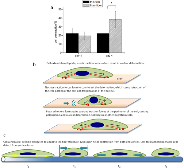 Cell contraction associated with migration on thin film and 8 µm fiber-(a) Measurement of cell contraction on micron fibers and flat films at day 1 and day 4. Cell contraction on micron fiber is defined as: (cell length at t0- cell length at t1-)/cell length at t1- *: P<0.001. (b) Illustration of cell contraction when migration on flat film. (c) Illustration of cell contraction when migration on 8 µm fibers at day 4 [Qin et al. PLoS ONE 2015; 10: e0119094].