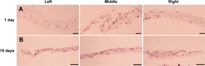 Filling a highly porous three dimensional electrospun fibrous block with cell suspension will result in most cells settling to the bottom of the well instead of attaching on the fibres. This is understandable since the rounded cells would easily fall through large pore openings. Such difficulties in cell seeding are not restricted to electrospun 3D scaffold. Other highly open 3D scaffold also face the same challenge. Electrospinning has been used for encapsulation of cells within the nanofibers [Townsend-Nicholoson et al 2006, Ang et al 2014]. In scaffold constructed using fuse deposition, electrospun fibers have been used in combination with it to create an environment that resembles extracellular matrix (ECM). However, having the electrospun mesh layers do not address the challenge of seeding the cells. When the electrospinning duration is too long, the pore size between the interconnecting fibers will be too small for cell infiltration. Too short a spinning duration will result in insufficient fiber covering the pores between the struts resulting in poor cell distribution throughout the scaffold. Lee and Kim (2014) used 10s electrospinning duration to deposit fibers between strut layers. To transfer cells within the scaffold, struts comprising of alginate and poly(ethylene oxide) with cells loaded within were laid between PCL struts. After 7 days of culture, the cells were found to be well distributed throughout the scaffold.