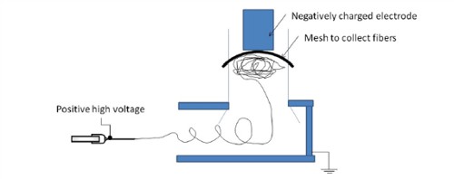 Using a similar concept, Joseph et al (2015) used a collector comprises of sharp spokes evenly distributed around an axis and radiating towards the electrospinning spinnerets. Two spinnerets of opposing polarity were used for electrospinning fibers from the edge of the collector. To create a fluffy ball of nanofibers, electrospinning jet of opposing polarity is needed and the collector needs to be rotated. The opposing polarity is needed to cause collision of the electrospinning jet in mid-air. The rotation creates a pressure drop inside collector and the resultant inward airflow sucks the electrospun fibers to the center of the collector to form a fluffy clump of fibers.