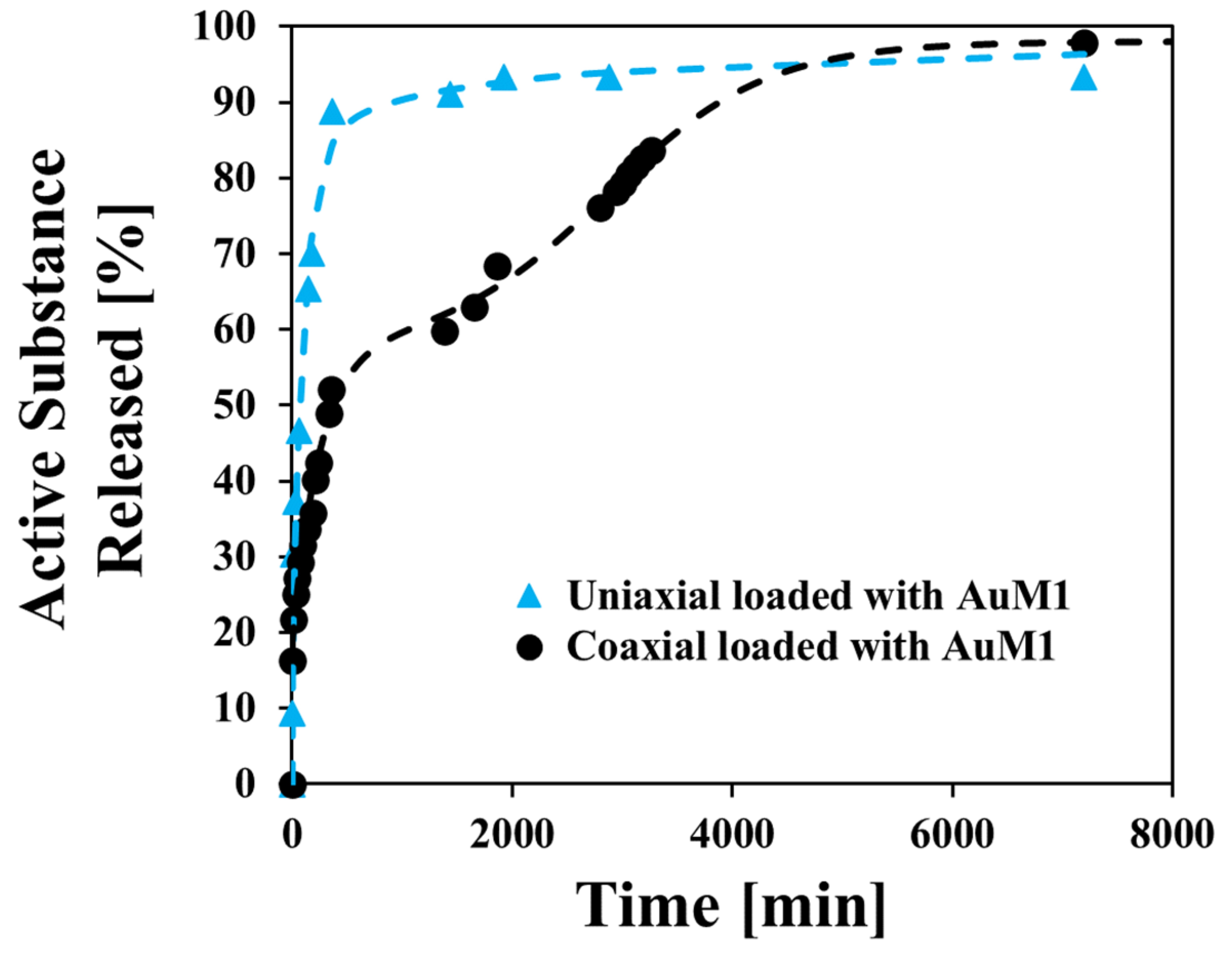 Longo et al (2024) demonstrated the effective use of core-shell electrospun fibers to reduce the release rate of antitumour agents compared to blended systems. Synthetic gold complex (AuM1) was the antitumor agent for encapsulation into a core-shell fiber with polyvinyl alcohol (PVA) shell and the AuM1 blended with polycaprolactone (PCL) core. A PBS solution was used to test the release of AuM1. Interestingly, although PVA is soluble in PBS, the core-shell fiber with PVA as the shell was able to slow the release of AuM1 to 90% over 3 days. This compared to 90% release from uniaxial fibers of AuM1 blended into PCL, in an hour. It is possible that as a uniaxial fiber, most of the AuM1 are located at or near the surface of the fiber. However, for the core-shell fiber, the hydrophilic PVA shell may discourage AuM1 from residing at the core-shell interface and instead, distributed deeper within the PCL core. The PVA in PBS was found to swell before gradually dissolving which may also hinder the release of AuM1. Looking at the release profile of AuM1 from the core-shell fibers, there was an initial faster release rate although at a slightly lower gradient than the release of AuM1 from uniaxial loaded PCL. This may be attributed to AuM1 that was initially found on the interface of the core-shell material. Swelling and dissolution of PVA in the first 16 h released about 50% of AuM1. This was followed by a much slower release of AuM1 from the remaining PCL matrix.