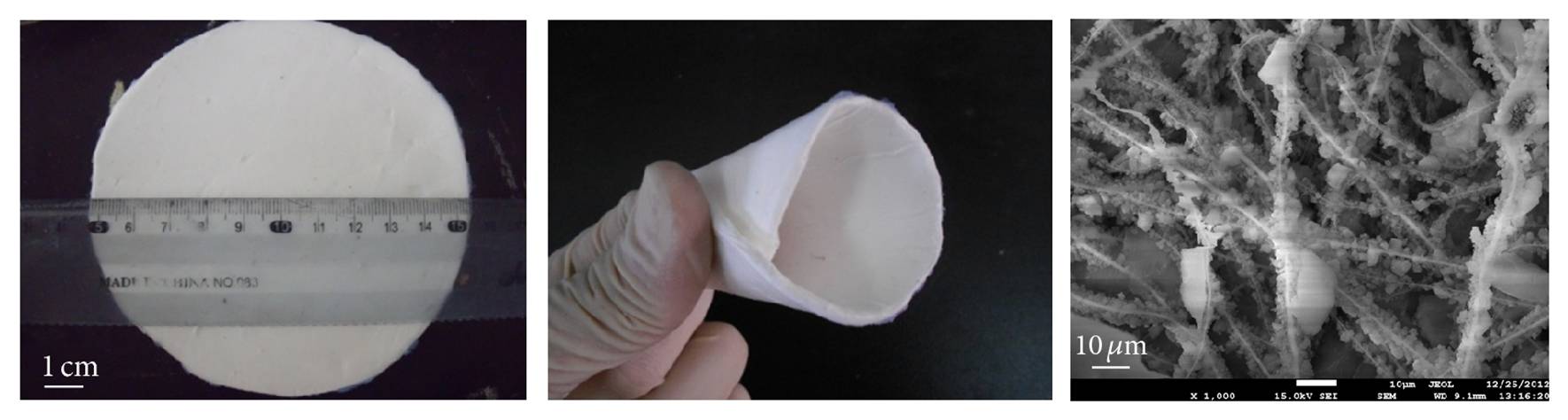 Beyond membrane form, electrospun fibers may be made into 3D foam structure. Si et al (2014) constructed a foam made of short strand electrospun fibers. A mixture of polyacrylonitrile/benzoxazine (PAN/BA-a) electrospun fibers and SiO2 electrospun fibers were used to made into the foam. The ultra-low density of the freeze dried foam makes it comparable to aerogel. The lowest density obtained was 0.12 mg/cm3 with porosity of 99.992%. The foam showed good thermal insulation property with prominent thermal conductivity of 0.026Wm-1K-1 which is close to that of air at ambient condition. Such good insulation property has been attributed to its high porosity. When the porosity reduces, thermal conductivity increases.