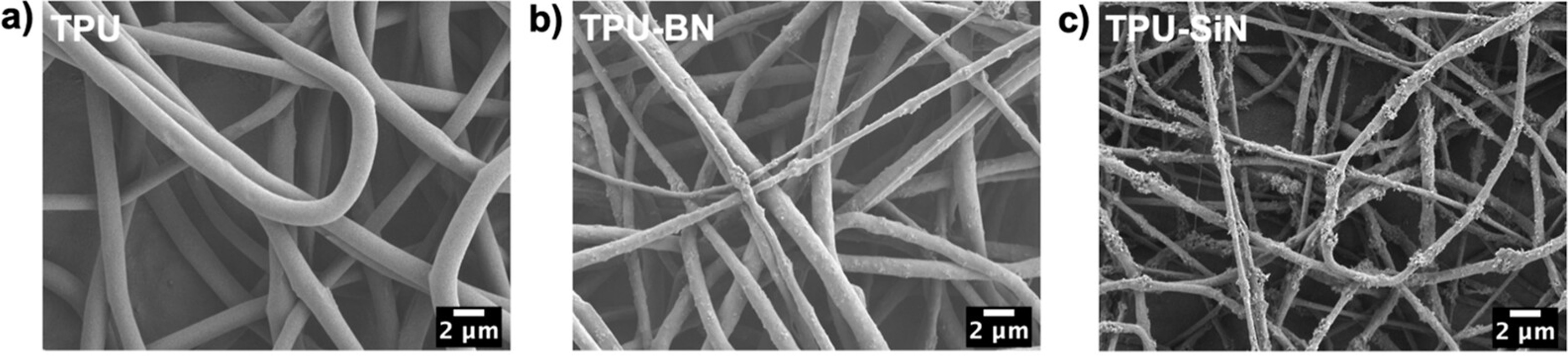 Moradi et al (2024) tested the thermal performance of electrospun thermoplastic polyurethane (TPU) loaded with boron nitride (BN) and silicon nitride (SiN) nanoparticles. Theoretically, BN has a higher thermal conductivity than SiN although commercially available SiN nanoparticles are smaller and at a lower price compared to BN. Thermal performance test using scanning thermal microscopy (SThM) showed that electrospun TPU/SiN membrane has a better thermal performance compared to electrospun TPU/BN membrane. The better performance of electrospun TPU/SiN membrane despite SiN having a lower thermal conductivity has been attributed to the smaller fiber diameters in TPU/SiN membrane, greater density and connectivity of SiN nanoparticles in the TPU fibers which formed better conduction network in the composite structure. SiN nanoparticles were also found exposed on the surface of the nanofibers while BN nanoparticles were mostly encapsulated within the fiber matrix. The exposed SiN nanoparticles may encourage heat dissipation through direct contact between the nanoparticles.