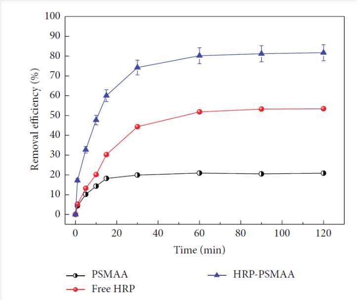 The performance of catalytic activity of immobilized enzyme compared to free enzymes depends on whether the fiber material is able to complement the process. Encapsulation and immobilization of papain on electrospun polyvinyl alcohol (PVA) using GA showed catalytic activity that was only 88% that of free enzyme [Moreno-Cortez et al 2015]. However, the removal of o-Methoxyphenol by the immobilized HRP at 80% was better than free HRP. This has been attributed to PSMMA nanofiber for facilitating adsorption of the harmful chemical and bringing the chemical closer to the enzyme for deactivation. Dai et al (2013) also made similar observation using laccase immobilized in different electrospun fibers for the removal of polycyclic aromatic hydrocarbons (PAH). The degradation efficiency of the laccase immobilized nanofibers depends on the hydrophobic-hydrophilic properties of the fiber material which influenced its ability to absorb the PAHs. By concentrating the PAH molecules around the enzyme molecules on the nanofibers, it brings about greater degradation efficiency which was better than free laccase. Using electrospun poly(acrylonitrile-comaleic acid) (PANCAA) for covalent bonding of lipase, Wang et al (2006) showed that the addition of multi-walled carbon nanotube (MWCNT) into the electrospun PANCAA matrix was able to increase the activity of the enzyme. The MWCNT facilitate the activity by increasing electron transfer in the reaction.