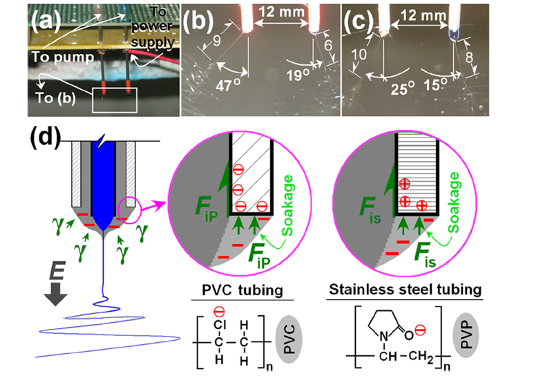 Reduction in the power consumption of the electrospinning process can be achieved by modifying the nozzle design. For initiation of electrospinning jet, energy is expended to overcome the surface tension and capillary action of the solution. Kang et al (2020) showed that by inserting a solid Teflon needle in the nozzle, they were able to reduce the power needed for electrospinning. To further reduce energy loss to the environment, much of the metal nozzle was covered with epoxy resin except a short section at the tip for connecting to incoming power. Using polyvinylpyrrolidone (PVP) as the model solution for testing the nozzle design, they found that having a solid Teflon needle in the nozzle for electrospinning and insulation of the tip, only uses 54% of the power of conventional metal nozzles. This was calculated from the reduced voltage required for steady electrospinning and lower current. Such power reduction has been attributed to the hydrophobic Teflon inner rod that reduces the capillary counter force and the concentration of the applied charges to the solution at the tip. Evidence of more efficient charging of the electrospinning jet can be seen by a longer stable jet phase and larger spiraling radius of the electrospinning jet with the modified nozzle.