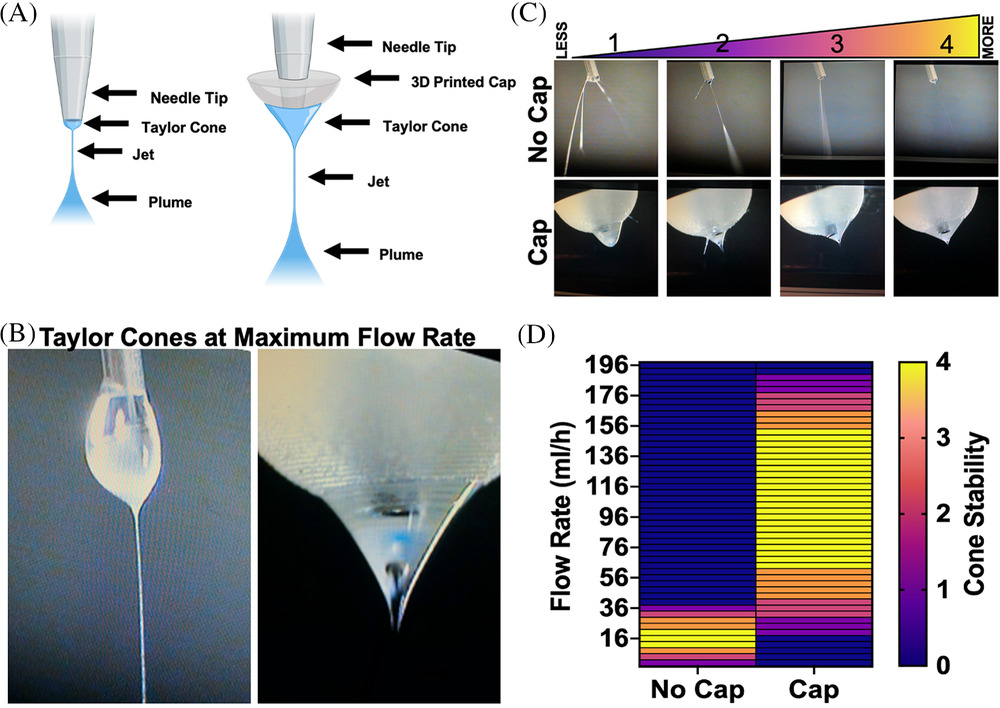 An important function of the nozzle is to maintain the shape of the Taylor cone and to reduce the capillary force that is pulling back the solution. McCarthy et al (2021) installed a 3D printed needle cap on the tip of the electrospinning nozzle to improve Taylor cone stability at higher solution feed rate. Due to the conical shape of the cap, it reduces excess solution from wicking up the outer surface of the nozzle due to capillary action. The shape of the cap also widens the meniscus diameter of the Taylor cone and a wider meniscus diameter has been shown to give a more stable jet. Without the cap, a pendant-shaped Taylor cone is formed which is less stable compared to a conical-shaped Taylor cone. With the cap, the Taylor cone maintained a conical-shape even at maximum flow rate.