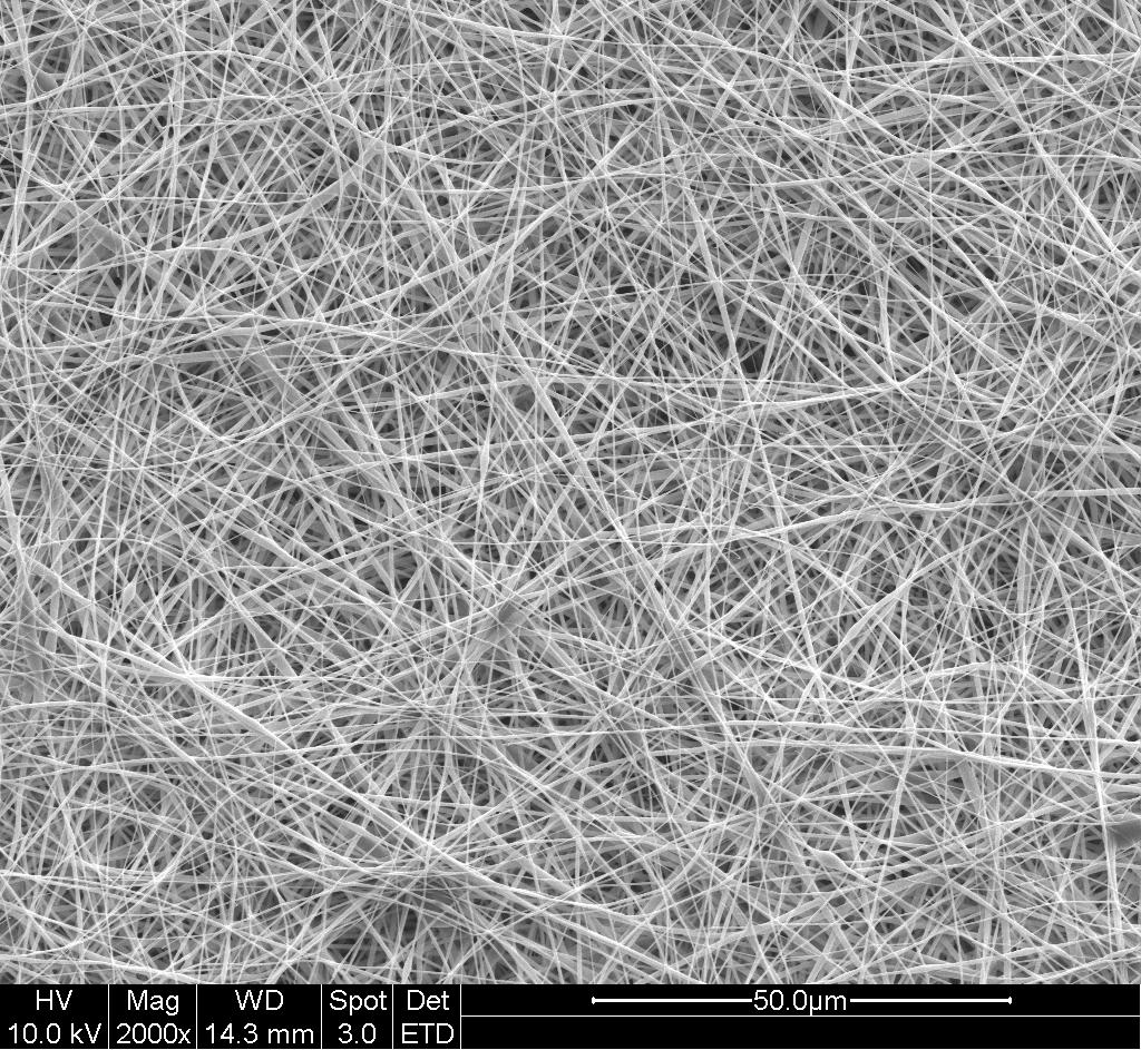 Heat treated polysulfone electrospun nonwoven membrane, fiber dia. approx. 470 nm
